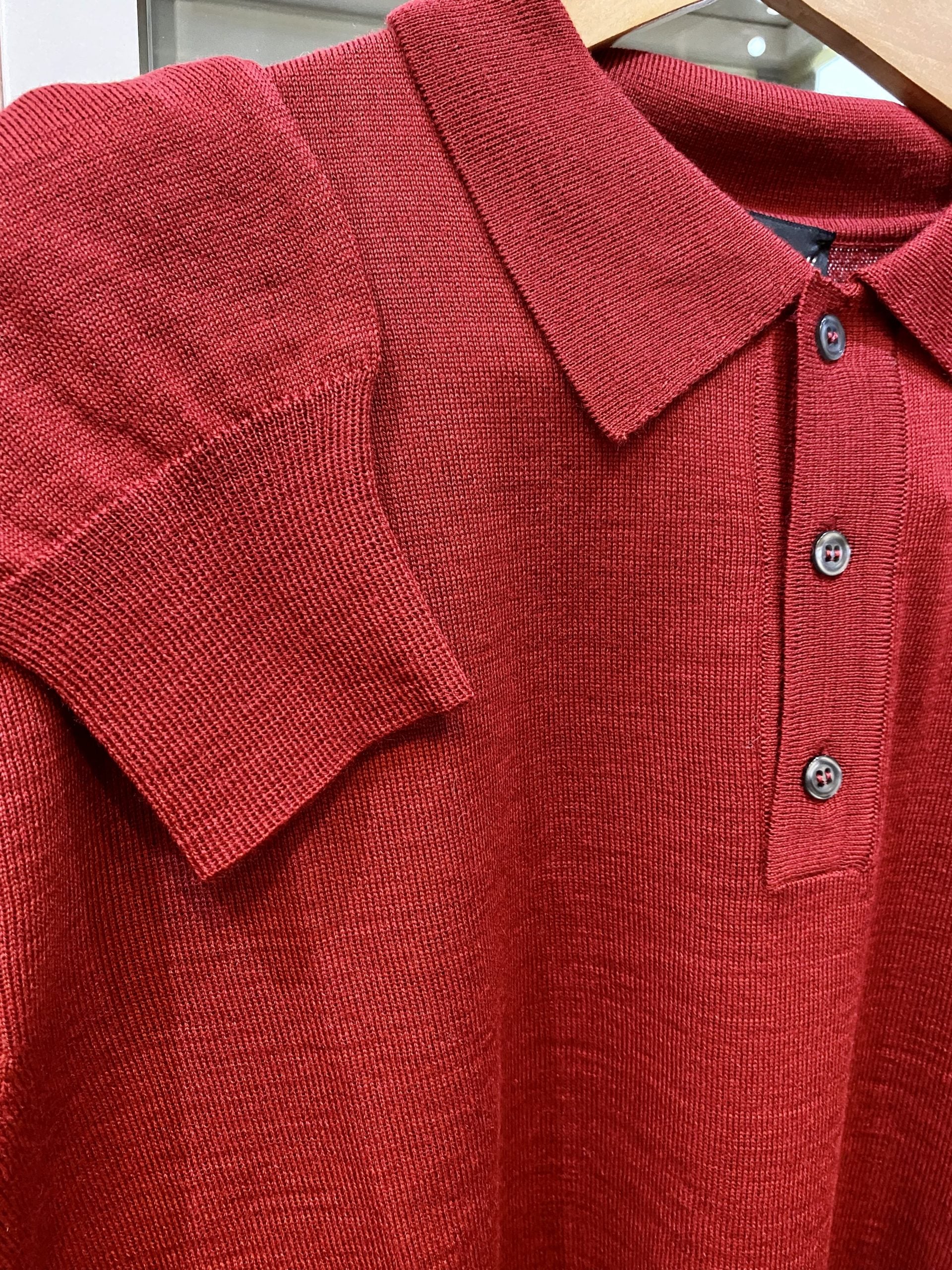 Made in Italy from the finest blend of Merino wool and acrylic yarn. Super fine light weight 21 gauge. 50% Merino Wool 50% Acrylic 3 Button Polo sweater.
