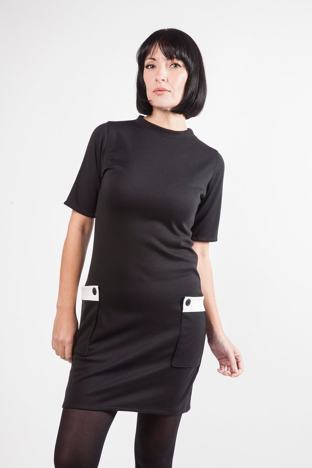 Effortless styling in this short-sleeve classic black mod dress from Love Her Madly. Two deep pockets finished with white trim. Featured in the Paul Weller-inspired film, The Pebble and the Boy, as worn by Patsy Kensit.
